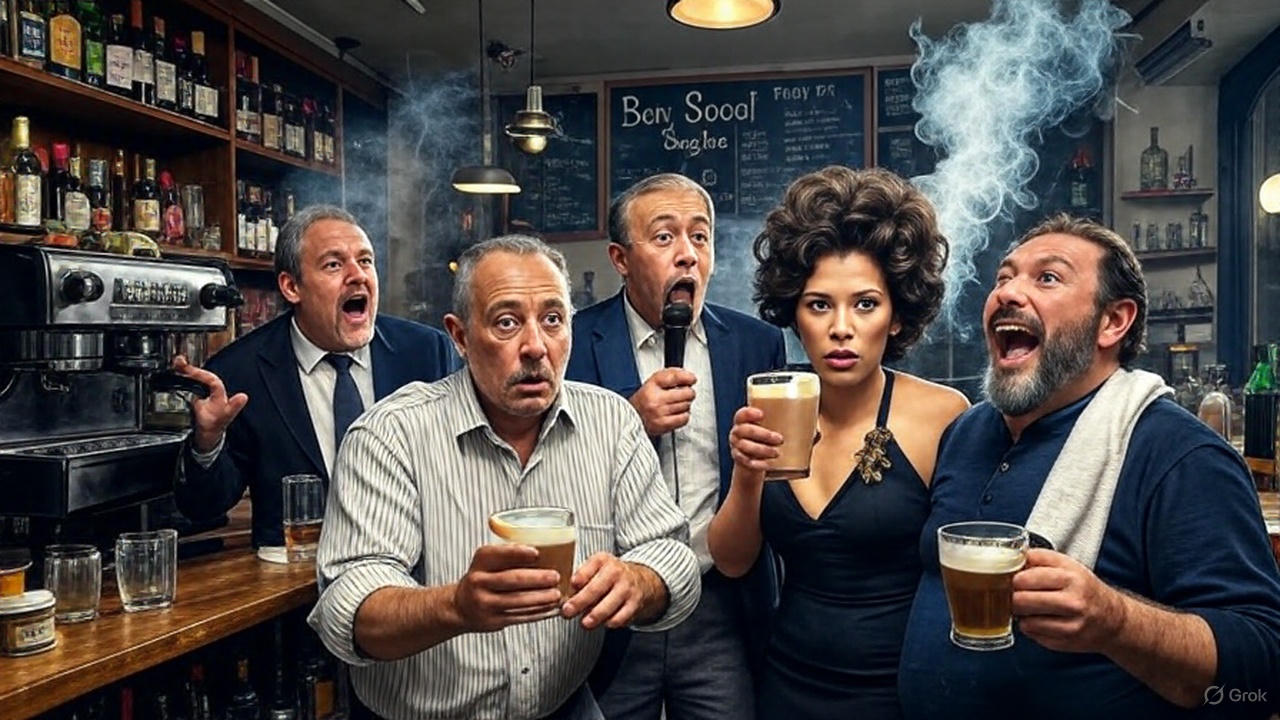 El Poeta, titolare nonchè filosofo del cappuccino, pulisce il bancone con uno straccio che ha più batteri del virus stesso e sentenzia in rima:
