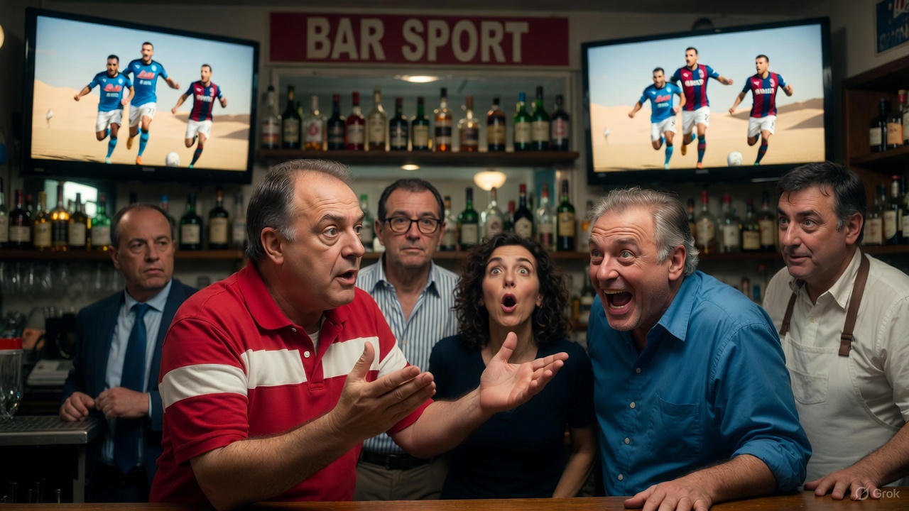 Il Peppone, meccanico con la barba piena di neve sciolta e le mani ancora nere d’olio, batté il pugno sul bancone facendo saltare le tazzine: «Io dico Bologna! Hanno eliminato l’Inter ai rigori, Ravaglia ha parato come un gatto con nove vite. E Immobile? Quello segna il rigore decisivo come se fosse una ruota da stringere. Napoli forte, sì, ma Conte è sempre arrabbiato come un cliente che trova la macchina non pronta. Stasera deserto, sabbia che entra negli scarpini, pallone che rimbalza strano… vince chi ha più fortuna, come quando cambio una frizione al buio!»