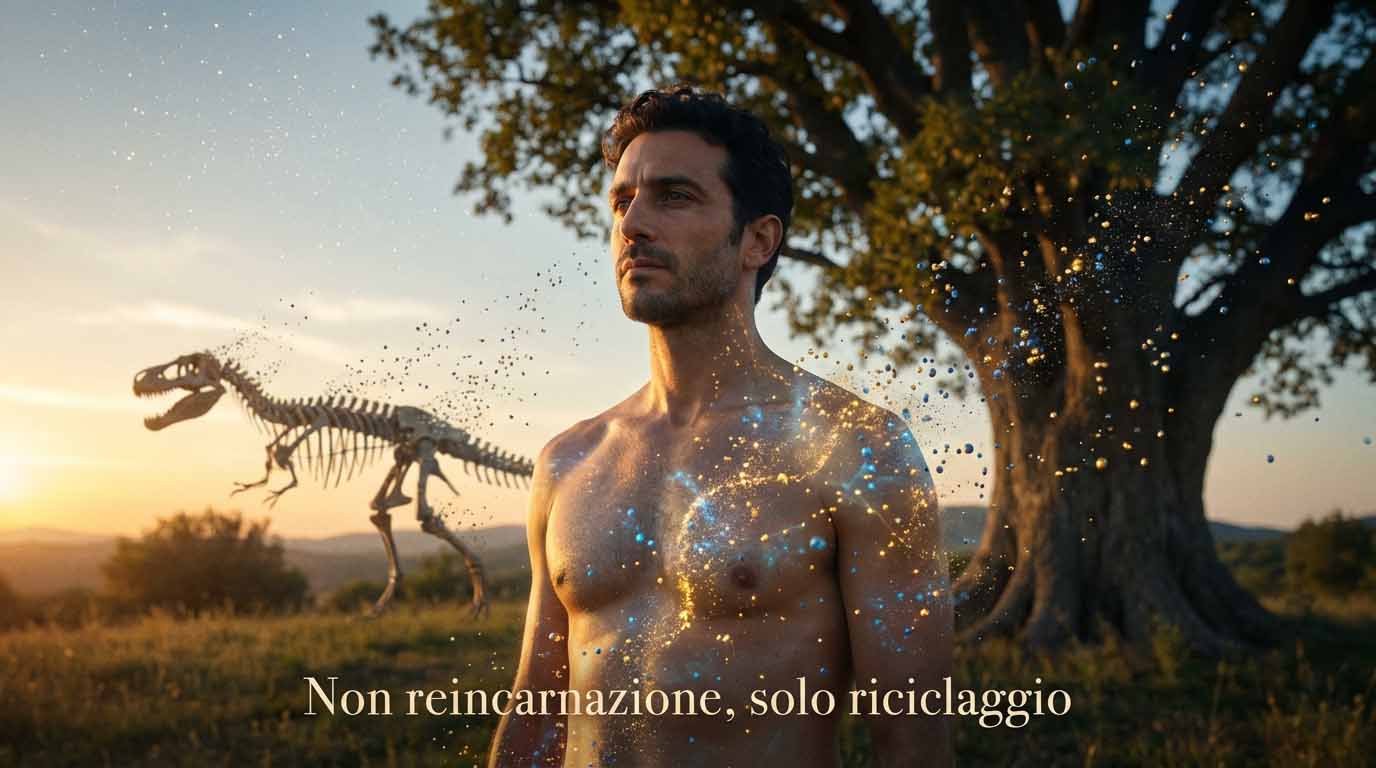 Non credo nella reincarnazione. Credo nel riciclo. Non sono stato un faraone in un’altra vita, né un guerriero vichingo. Sono fatto di atomi prestati. Gli stessi atomi che hanno vissuto in un dinosauro, in una sequoia millenaria, nel polmone di qualcuno morto secoli fa. Oggi si sono organizzati nella mia forma, nel mio corpo, nella mia coscienza. E quando me ne andrò, continueranno il loro viaggio senza di me.